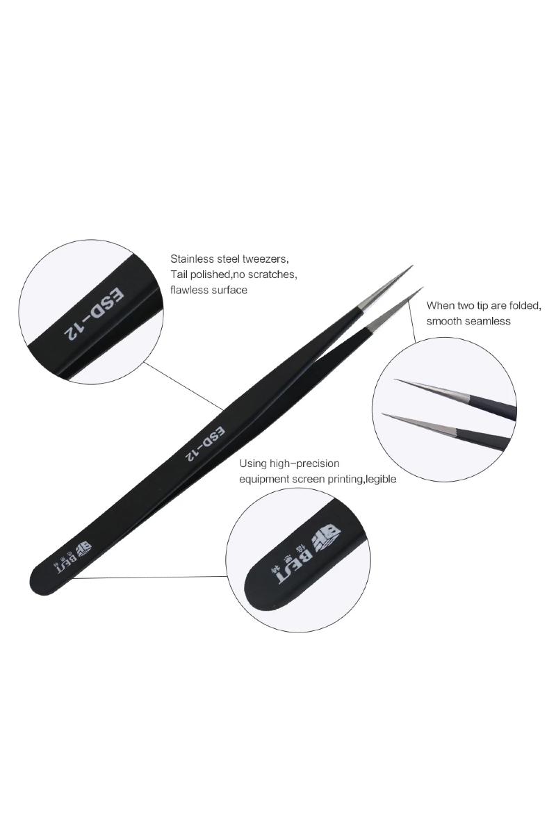 BEST BST-12ESD antistatisk pinsett er et profesjonelt presisjonsverktøy utviklet for arbeid med ESD-følsomme elektroniske komponenter. Denne ESD-sikre pinsetten beskytter sensitive deler mot statisk elektrisitet og er ideell for bruk innen elektronikkreparasjon, kretskortarbeid, mobilreparasjon og laboratoriearbeid.