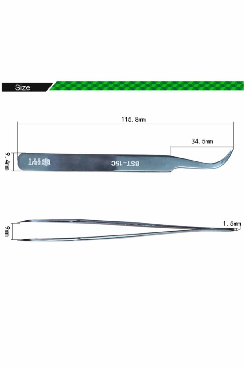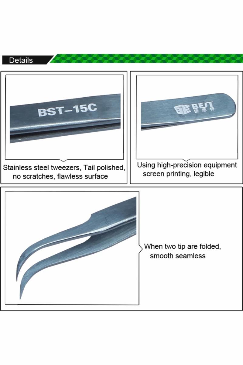 BEST BST-15C presisjonspinsett er et presisjonsverktøy utviklet for nøyaktig håndtering av små komponenter innen elektronikkreparasjon, kretskortarbeid, mobilservice og laboratoriearbeid. Pinsetten gir et stabilt og kontrollert grep og er godt egnet for både profesjonelle teknikere og hobbybrukere.